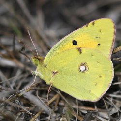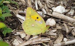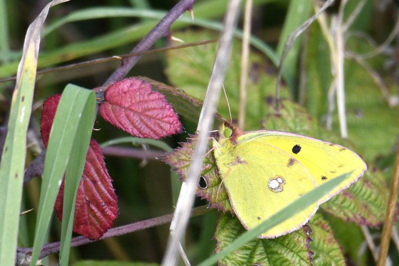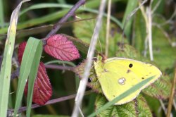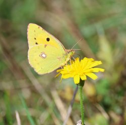 Itchen Abbas farmland. Farmers often get a bad press, but most of our local farms do what they can to encourage biodiversity, particularly by leaving wide margins with plenty of wildflowers. The butterflies have really benefited this year with many of the common grassland and hedgerow species plus the odd gem, such as this Clouded Yellow which I've seen in pretty much the same spot over the last two days. [Posted by Rupert Broadway]