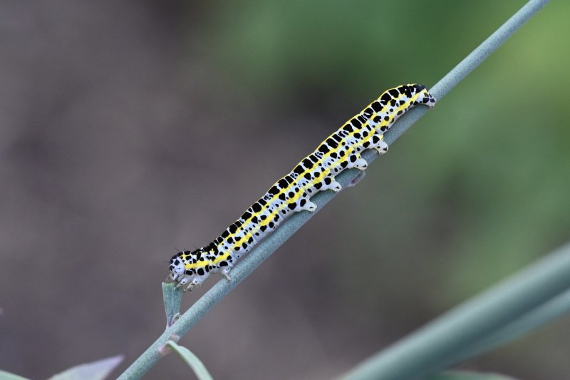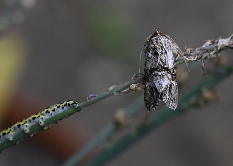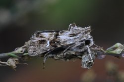 Toadflax Brocade. This species continues to thrive in my garden in VC12 on cultivated forms of Linaria pupurea (var 'Canon Went' and 'Springside White') as well as being seen on Linaria vulgaris today. Exceptionally this year I've had larvae evident at the same time as adult - a moth on the move. [Posted by Chris Piper]