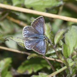 Blues and Yellows at Broughton Down. I was hoping to see Silver-spotted Skipper at Broughton Down yesterday, but it was not to be. It was my first visit in eight years and the covering of dogwood and hawthorn scrub was more widespread than I remember, particularly on the eastern half of the reserve. Common Blue was doing very well, genuinely living up to its name. I didn’t see a Chalk Hill Blue until the tumuli near the western end of the site and, beyond that, there was a lovely chalk grassland meadow and earthwork ditches with many more Chalk Hills, a few Adonis Blue and Brown Argus, and plenty more Common Blue. A strong Brimstone emergence was underway and a couple of Clouded Yellows added to the colourful spectacle. Thirteen species counted in total. [Posted by Kevin Freeborn]