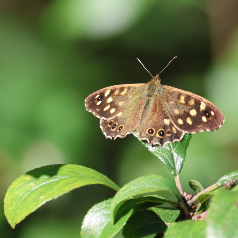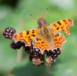 Autumn butterflies in Home Wood. On a recent wander into Home Wood on my local patch, I came across four comma on one bramble bush, all within one metre of each other; but they had contrived to position themselves in such a way as to make it impossible to see them all in one photograph, which was a pity. Four speckled wood also seen in the same area. [Posted by Kevin Freeborn]