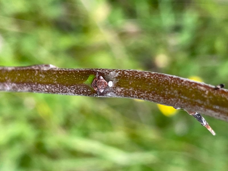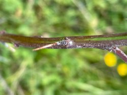 Brown Hairstreak ova on Portsdown. As in other parts of the country Brown Hairstreak is spreading far and wide in Hampshire. Until a few years ago the nearest to me was twenty miles away. A cursory check of a few blackthorn suckers on this mornings dog walk quickly turned up a couple of eggs in another new area near Fort Purbrook [Posted by Mark Tutton]